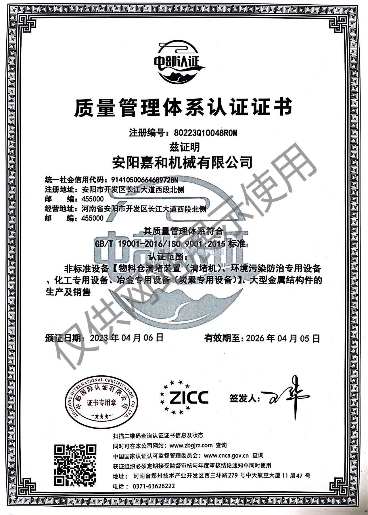 质量管理体系认证证书